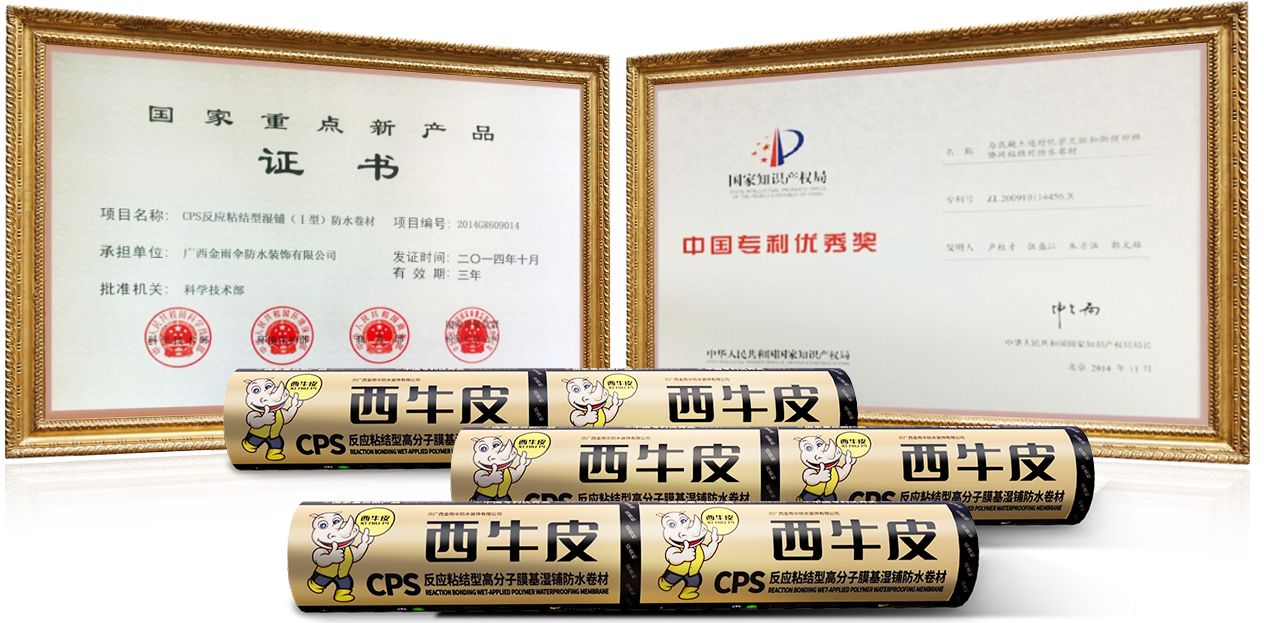 - 国家重点新产品国内湿铺防水卷材首次获得此证书的产品CPS反应粘湿铺防水卷材,2014年获国家重点新产品计划项目立项(国科发计(2014)303号),这是国家层面对西牛皮防水(原广西金雨伞防水)突破混凝土建筑渗漏难题技术瓶颈的肯定,是目前国内湿铺防水卷材唯一.获得此证书的产品。