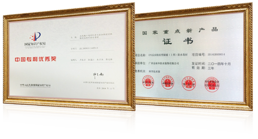 CPS反应粘技术发明专利(专利号200910114456.X) , 2014年获得中国专利优秀奖,这是混凝土密封防水领域首次获得的中国专利奖。该项专利技术产品是对混凝土密封防水革命性的突破,填补了该领域的空白,解决了世界混凝土密封防水的难题。让节点防水密封膏及防水卷材与水泥同步固化反应粘结,跟混凝土长在一起的技术,实现了对混凝土粘结牢固不可逆的全面密封防水;